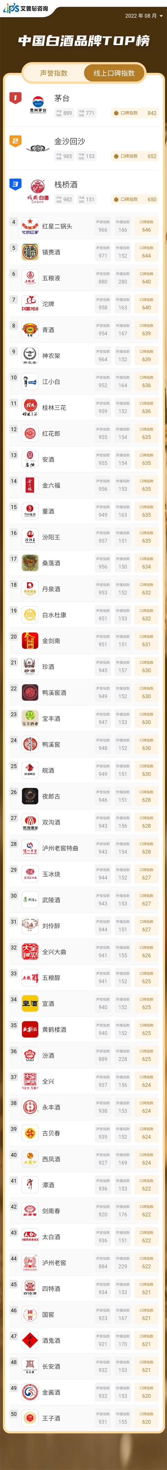 據中國酒業協會數據,2017-2020年,我國白酒規上企業數量連續下降,尤其受疫情沖擊,白酒消費場景被阻斷,2020年白酒規上企業降至1040家,同比減少58家,預計2022年將降至997家。中國白酒市場呈現日益明晰的集中化趨勢,馬太效應明顯。互聯網時代,白酒品牌要想在市場洪流中站穩腳跟,需堅持用戶體驗為王的經營理念,重視消費者口碑,實現品牌營銷的雙向化與數字化。 艾普思指數原創榜單《中國白酒品牌線上口碑指數排行榜》旨在依托互聯網文本大數據分析技術,助力白酒企業把握品牌線上口碑表現,洞察消費者心理及需求,有針對性地實施品牌傳播策略,優化品牌形象,促進品牌長遠發展。 數據時效:2022年8月1日-8月31日 本期榜單