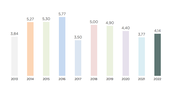 圖:波爾多葡萄園歷史采收 (單位:億升) 來源:Customs / CIVB 產(chǎn)量再次限制 連續(xù)3年,波爾多的采收季的產(chǎn)量低于近10年的平均水平。 首要的是,干旱對2022年葡萄總產(chǎn)量產(chǎn)生了重要影響。 2022年,極端氣候事件襲擊了葡萄園,在一些情況下導致重大損失: - 4月初,在整個波爾多地區(qū)有幾個結霜的夜晚。 - 6月20日至21日夜間發(fā)生極強雹暴,不同程度上影響超過10, 000公頃的葡萄園。 超高質(zhì)量的葡萄藤及酒農(nóng)的應對措施降低了損失。2022年的AOC葡萄酒產(chǎn)量為4.11億升, 即比10年平均水平低11%。