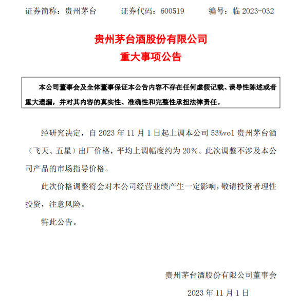 10月31日夜間,貴州茅臺(tái)發(fā)布重大事項(xiàng)公告。公告顯示,經(jīng)研究決定,自2023 年11月1日起上調(diào)本公司 53%vol 貴州茅臺(tái)酒(飛天、五星)出廠價(jià)格,平均上調(diào)幅度約為20%。此次調(diào)整不涉及本公司產(chǎn)品的市場(chǎng)指導(dǎo)價(jià)格。