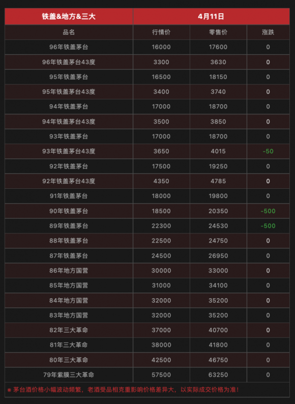 今天是2024年4月11日星期四,與昨日行情相比: 常規茅臺中:2024年飛天原箱,2024年飛天散瓶,2023年飛天散瓶,十五年年份酒,三十年年份酒,香溢五洲上漲。 次新茅臺中:2021年飛天散瓶,2013年飛天散瓶上漲;2017年飛天散瓶,2016年飛天散瓶,2015年飛天散瓶,2014年飛天原箱下跌。 老茅臺中:1999年飛天五星散瓶下跌。 鐵蓋&地方&三大中:1993年鐵蓋茅臺43度,1990年鐵蓋茅臺,1989年鐵蓋茅臺下跌。 珍品&陳年中:2022年三十年原箱下跌。 紀念酒中:2014年紀念巴拿馬金獎100年珍藏版,2019年慶祝建國70周年紀念酒(70周年小慶典),2012年鋼架版紀念島巢酒下跌;2003年紀念國酒茅臺產量突破萬噸上漲。 節氣酒中:立春酒500ml下跌。 生肖茅臺中:龍年生肖原箱上漲。 |