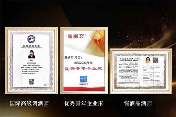 在貴州金絲玉瑪酒業目前已經發布的產品【五常系列】【順酒系列】【年份酒系列】【珍藏酒系列】中,不難發現處處都是時尚審美與優秀傳統文化的相結合。這就不難理解了,為什么章欣雨女士一手打造的金絲玉瑪【酒茶醬酒】能如此光芒四射,屢屢斬獲各項國內外大獎。而章欣雨女士本人也在短短的三年內通過自身的努力收獲了不少認可,于2022年獲得“國際高級調酒師證書”和“國家中級白酒品酒師證書”;2024年榮獲“優秀青年企業家”的稱號。
