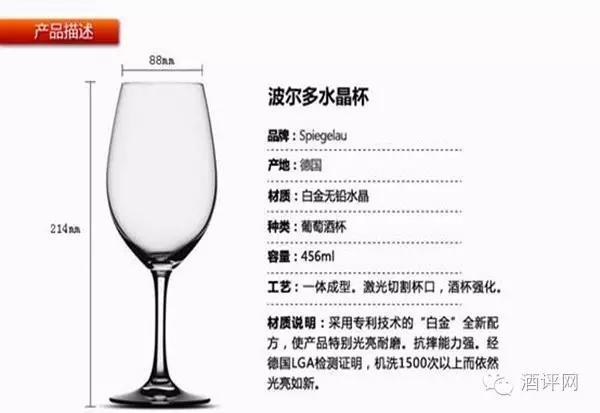 酒杯的分類 酒杯的分類按工藝來分,可分為機器,半機器半手工,全手工;根據材質來分類,分為玻璃,一般水晶和無鉛水晶;也可根據產地與品牌來分,分類的標準不同,分法也不盡相同。 眾所周知,舌尖對應的是甜味兒,舌頭內側對應的是酸味兒,舌頭外側對應的是咸味兒,舌根部對應的則是苦味兒。杯子的形狀、杯口的大小決定了酒體入口時與味蕾的第一接觸點,從而影響酒的味道。不同風格的美酒需要不同風格的酒杯來陪襯,酒評君(微信號:jiuping_cn)和大家一起討論酒和酒杯的搭配。 1、波爾多杯 波爾多杯適合大多數法國產的波爾多紅葡萄酒。因為其酒酸度高,澀味較重,所以要求杯身長而杯壁呈弧線的郁金香杯形,因為杯壁的弧度可以有效地調節酒液在入口時的擴散方向。另外,較寬的杯口則有利于我們更為敏銳的感覺到波爾多葡萄酒漸變的酒香。